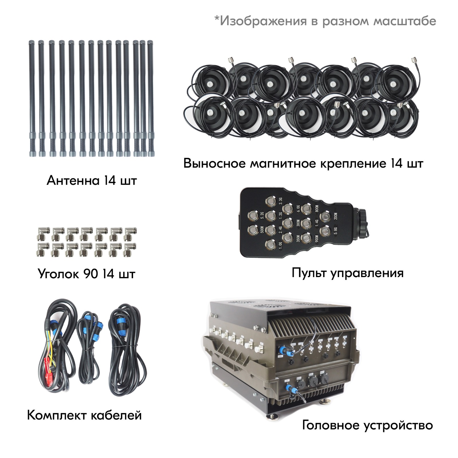 Комплект поставки: РЭБ автомобильный Герань 14, Комплект кабелей для питания, пульт управления, 14 магнитных креплений, 14 коннекторов 90 градусов.